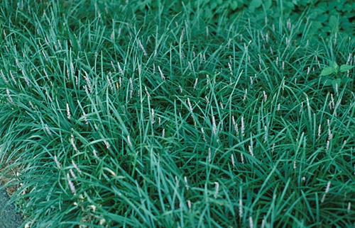 This tough, cold hardy (to Zone 4), spreading, semi-evergreen groundcover forms dense mats of grass-like plants topped with pale-purple flowers on violet-brown stems. Can protect soil from erosion in full shade or full sun, but is too aggressive for border plantings.