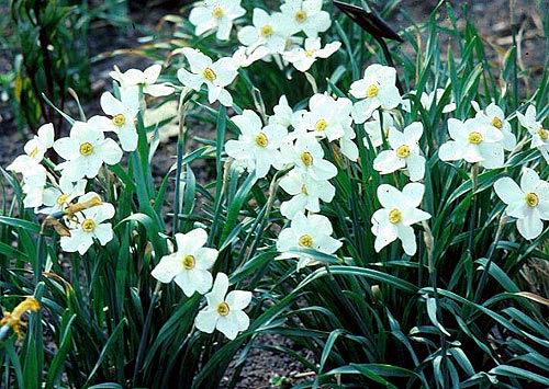 ‘Actaea’: 1 ˝’ tall plants with fragrant, late blooms with flat white perianths and shallow red-rimmed yellow cups.‘Cantabile’: 10” tall plants with pure white perianths and small but showy cup that has a green center, rimmed with yellow, and then with red at its outer edge.