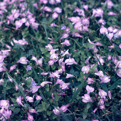 Tiny, two-lipped flowers are purple–blue with white yellow, or purple spotting on their lower lips.