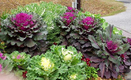 Leaves vary in color, depending on the variety. Colors include: pink, white, cream, green hues, purple, and red. The leaves have wavy edges.